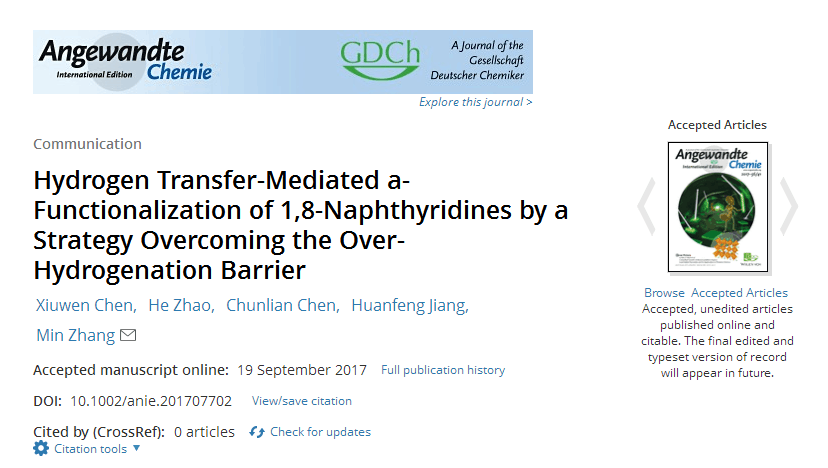 本网讯 近日,我校化学与生物工程学院陈修文博士以第一作者身份,在化学领域顶级期刊Angewandte Chemie(影响因子:11.994)上在线发表专题论文《Hydrogen Transfer-Mediated -Functionalization of 1,8-Naphthyrid- ines by a Strategy Overcoming the Over-Hydrogenation Barrier》。