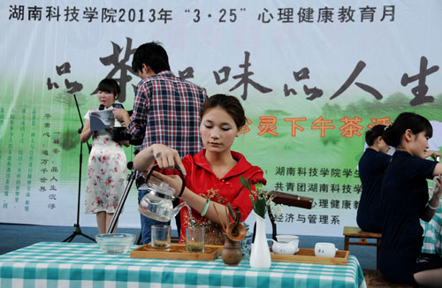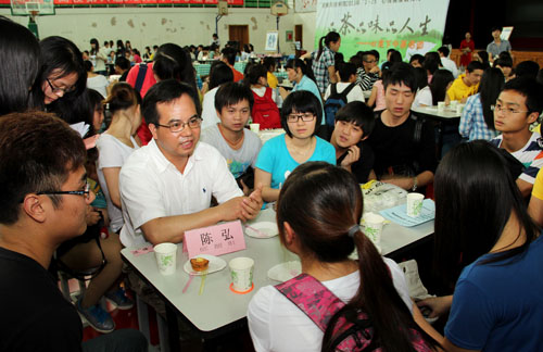 随后,在5月的茶文化节上,第一次见到陈书记,他坐在第一排,特意来参加学生举办的活动。活动还没开始,校领导们纷纷入座,同学们自顾自的聊着天,然而陈书记却一个转过身,把自己桌上的水果和点心递给了身后的学生,微笑道:“同学们,吃点水果。”我们个个面面相觑,书记竟然主动跟学生打起了招呼,确实有些吃惊。活动结束,老师们离席,陈书记却再次转身走到学生中间,跟同学聊起天来,问大家在学校都有遇到哪些困难,需要学校迫切解决什么问题,大学里都有哪些打算和想法等等。同学们开始比较拘谨,尔后人却越聚越多,很快就把陈书记团团围住,每个人似乎都有很多话想要说。陈书记一直微笑,认真地听着学生们的畅所欲言。从此,在学生食堂里,在操场上,在图书馆门口,就连陈书记吃饭或散步的时候,都不忘走进学生堆里,跟大家聊上几句。渐渐地,他成了我们学生中最亲近的人。