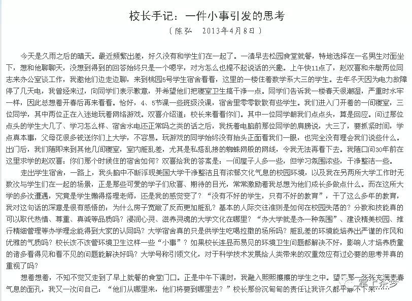 去县城的路上,我的思绪一路飘回了我的大学时代。2011年我考入安博官网app,陈弘书记就是在那一年调到我们学校当校长的。那时的我,不过是丢到人群里的一粒沙,不,我比沙还渺小。因为高考不得志,因为专业没选好,也因为家庭原因,我十分的迷茫、不安、自卑甚至封闭。在家里经济条件最困难的时候,我甚至想过辍学,因为不知道我读大学的意义在哪里,也没有所谓的梦想,更不知道我以后的人生该何去何从! 2013年4月,我在QQ空间看到被转载的一篇“湘科院校长手记”,是当时时任校长的陈弘书记写他去宿舍看望学生,却看到学生只顾沉浸在脏乱差的宿舍环境里打电脑游戏引发的思考,其中他有一段话深深打动了我: