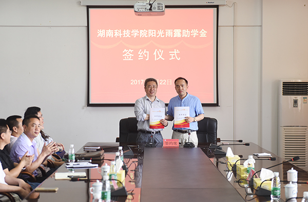 本网讯 5月22日上午,我校举行“ 阳光雨露助学基金”签约仪式。校长曾宝成,校党委副书记唐艳明,副校长吴小林,广富诚集团副总裁、优秀校友陈蓝云及各相关职能部门负责人出席签约仪式。