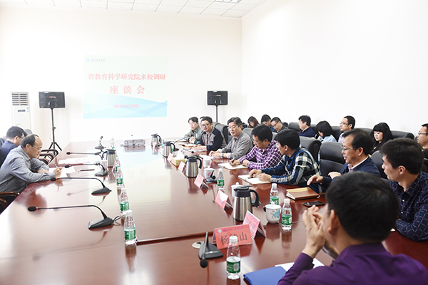 本网讯 4月19日上午,省教育科学研究院院长石灯明,省教育科学规划办常务副主任、省教育科学院规划所所长杨敏一行来校调研。副校长宋宏福、郑山明出席座谈会。