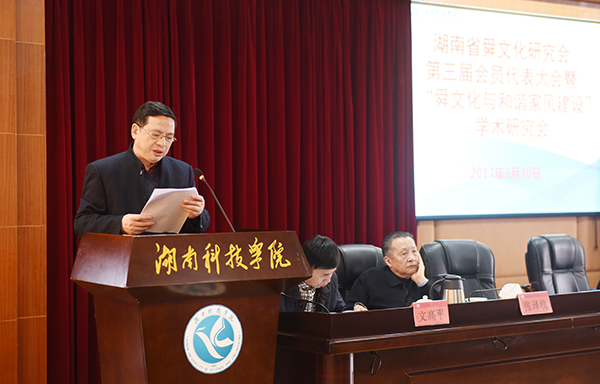 本网讯 3月30日上午,省舜文化研究会第三届代表大会暨舜文化与和谐家风建设学术研讨会在校举行。大会选举产生了新一届理事会,工会主席、副校级督导陈仲庚教授当选新任会长。省人民政府原副省长、省人大原副主任、省舜文化研究会会长唐之享出席并讲话。永州市人民政府副市长谢景林,校长曾宝成出席。会议由省社科联原执行主席、省舜文化研究会副会长、研究员陆魁宏主持。
