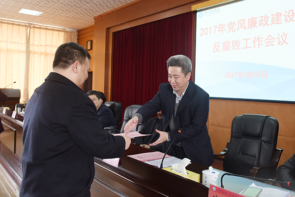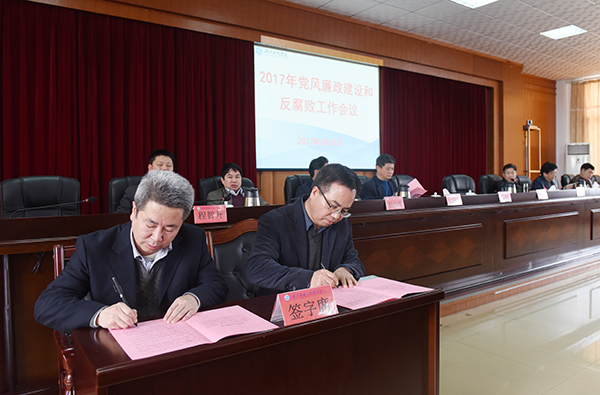 会议正式开始前,全体与会人员开展了《安博官网app廉政公约》签名活动。会上,校领导班子成员分别向党委书记陈弘同志签订并递交了《党风廉政建设目标管理责任书》,各二级单位党政负责人分别向分管校领导签订并递交了责任书。