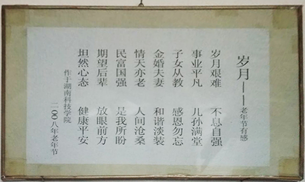 “岁月艰难,不息自强,事业平凡,儿孙满堂,子女从教,感恩勿忘,金婚夫妻,和谐淡装,情天亦老,人间沧桑,民富国强,是我所盼,期望后辈,放眼前方,坦然心态,健康平安。”一走进刘震老师的家中,赫然入目的便是这一首句句铿锵的四字词,题名为“岁月”的家训。这首词不仅时刻影响和熏陶着这相亲相爱的一大家子,更储存着刘震传承爱国、敬业、勤俭、善良和和谐的故事。在这些故事中,处处可见优良家风的传递和影响,无不印证了爱与和谐的力量。