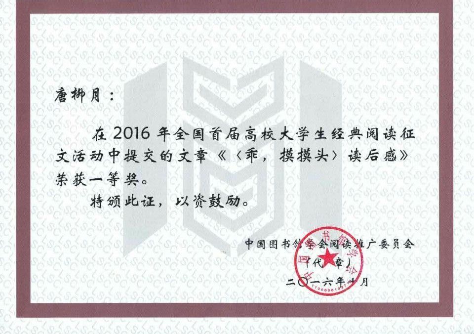 本网讯 近日,全国首届高校大学生经典阅读征文活动落下帷幕,由我校图书馆推荐的唐柳月同学作品《< 乖,摸摸头>读后感》荣获一等奖。