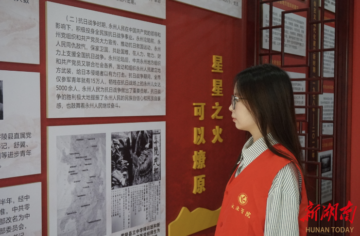 展厅通过大广角清晰展现伟大正确的中国共产党领导全国人民战天斗地、风起云涌、敢教日月换新天的巨幅画卷,又通过大焦距将永州零陵这片历史悠久、底蕴深厚、可亲可敬的红色热土拉近呈现到同学们眼前。张健老师在抗战史料的展板前告诉同学们:“国防关系到国家和民族生死存亡,中华人民共和国的每一位公民,都应自觉接受国防教育,增强国防意识。”