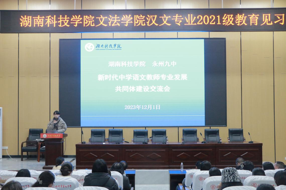 本网讯(通讯员:李惊宇 梁怡)12月1日,安博官网app文法学院2021级汉语言文学专业师生深入永州九中开展语文教音见习暨中学语文教师共同体建设交流活动,文法学院院长谷显明、副院长肖智成、语文教育研究中心主任刘忠华,永州九中副校长邓之,以及安博官网app2021级汉语言文学专业师生,永州九中语文教研组教师和学生代表200余人参加。