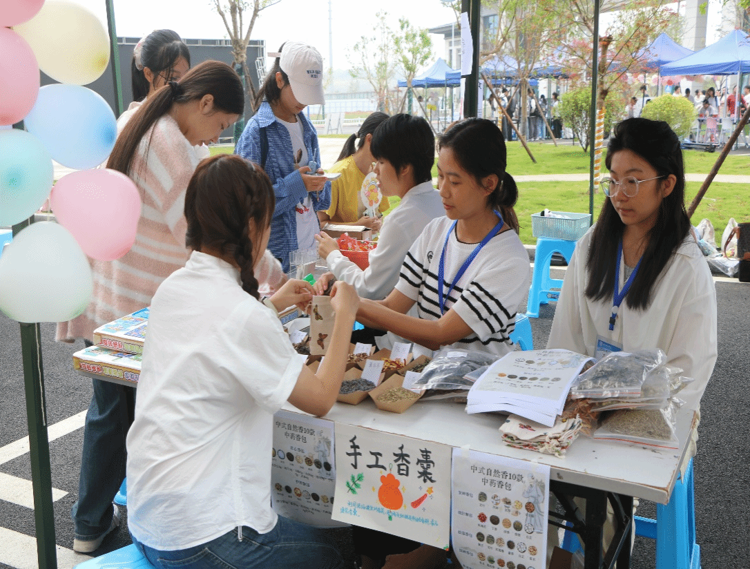 植物拓染活动“植愈之心,拓印秋韵”吸引了众多同学参与。大家漫步校园采撷秋叶和花瓣,以植物为笔,香囊为布,在专注的敲拓中将自然之美与内心宁静一同封存于独一无二的作品中。现场设置的香囊填装区也人气满满,同学们亲手挑选香料、调配比例、装袋系绳,在一草一木中梳理心绪,重建内心的秩序。空气中弥漫的草木清香,不仅是香囊的气息,更是心灵的安抚。“巧手抖球”、“表情包猜成语”等趣味游戏,更是欢声笑语不断同学们在轻松有趣的互动中释放压力,收获成就感与联结感。