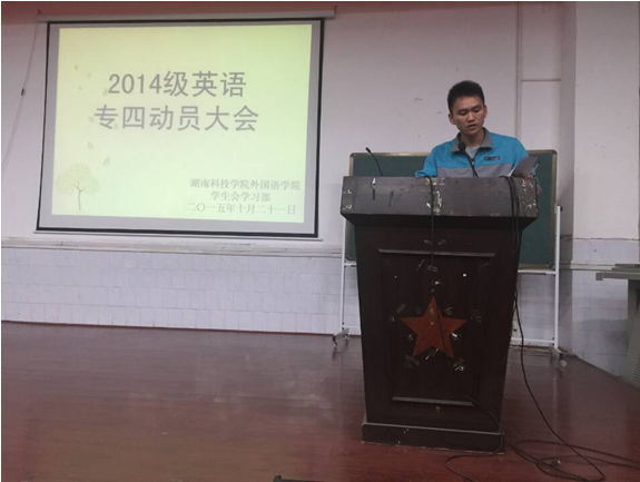 本网讯(通讯员 伍泳 夏湘怡) 为了更好的迎接全国高校英语专业四级考试,10月21日晚外国语学院大二学生在博雅楼东三召开2014级英语专业四级动员大会。该院院长欧华恩出席动员大会并作重要发言,14级辅导员陈小峰主持会议, 大三学生代表王冬方、刘鑫现场传授备考经验,为大二同学答疑解惑。