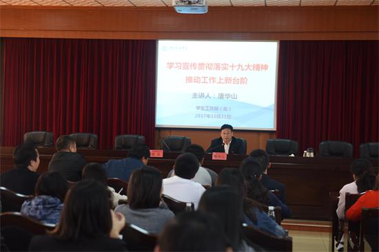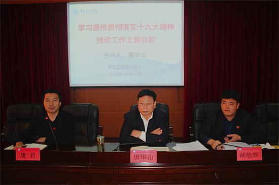 会上,唐华山指出,中国共产党第十九次全国代表大会的胜利召开选举产生了新的中央领导集体,标志着中国特色社会主义进入新时代,习近平新时代中国特色社会主义思想已经成为我党的指导思想和行动指南。作为从事高校思想政治工作的同志应该提高政治站位,强化“四个意识”,坚定“四个自信”,自觉用十九大精神和习近平新时代中国特色社会主义思想武装头脑、指导工作。围绕认真学习贯彻落实十九大精神的主题,他对全校学生工作和学工队伍建设提出了三点意见:一是改进学风不懈怠。要求每个同志努力成为一个乐于学习、勤于学习、善于学习的好老师。当前,要求全体同志结合实际深入学习十九大精神,特别是习近平新时代中国特色社会主义思想,不仅自己要做到学懂、弄通、做实,而且要在学生中大张旗鼓地进行宣讲,让十九大精神和习近平新时代中国特色社会主义思想尽快在学生中入心入脑,引导学生确立正确的世界观、人生观和价值观,迅速掀起学习十九大精神和习近平新时代中国特色社会主义思想的高潮;二是转变作风求实效。全体学工人员要以强烈的职业认同感和崇高的职业追求,不断提升从事思想政治工作的能力与水平,在实际工作中见成效;三是建设队伍促发展。队伍建设是基础、是关键、是保证,要看到新形势下队伍建设方面存在的问题与不足,努力形成相互学习、共同提高、尽展其才的良好局面。