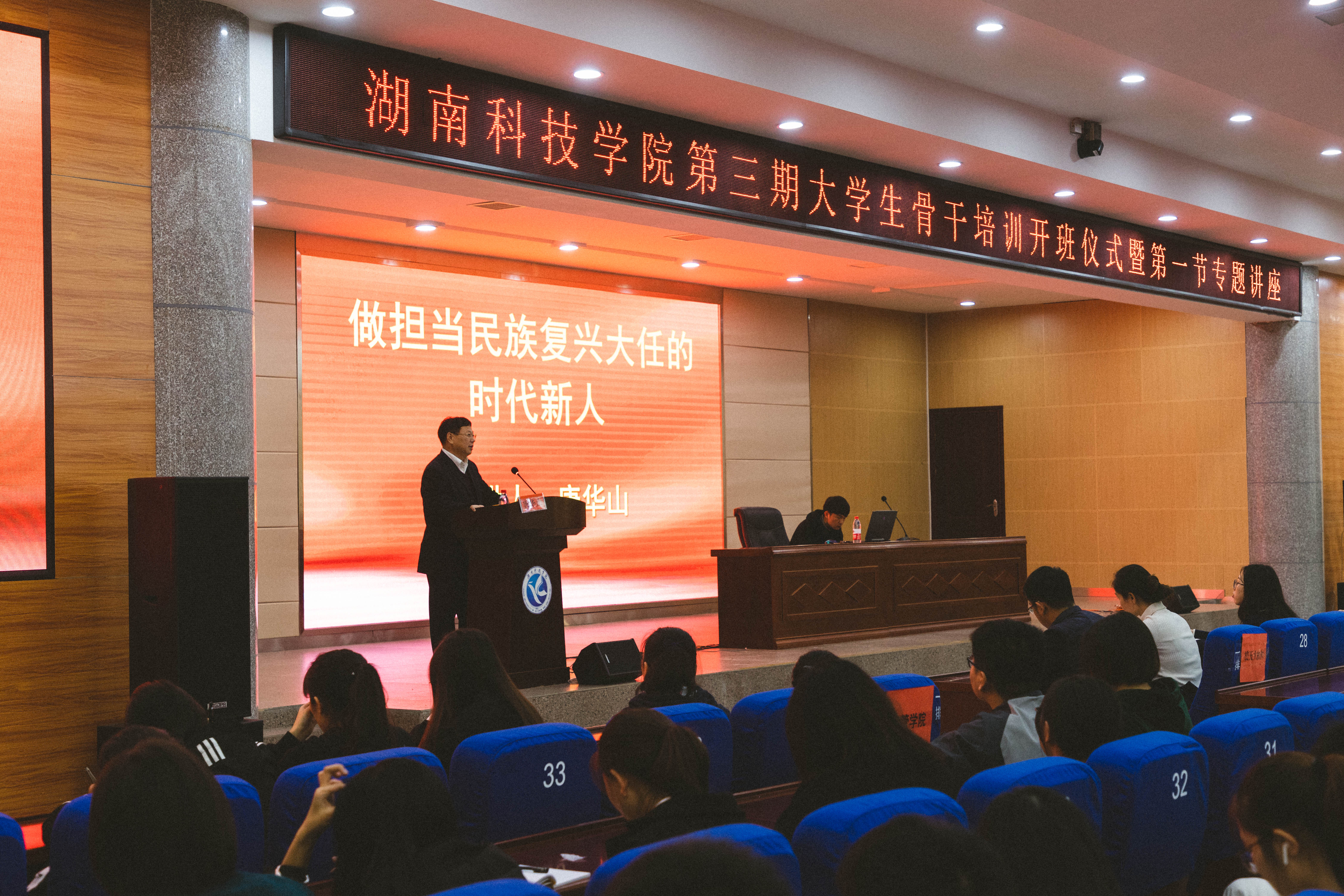 本网讯(通讯员杨涵)10月16日晚,我校第三期大学生骨干培训在潇湘大讲堂举行,校学工部、武装部部长唐华山担任主讲嘉宾,700余名学生骨干参加培训。