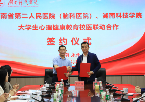 本网讯 4月3日,我校与湖南省第二人民医院(湖南省脑科医院)举行“校医合作”签约仪式。湖南省第二人民医院党委副书记陈勇 ,永州市脑科医院党委书记、主任医师龙海鹏,校党委委员、副校长吴小林出席会议。