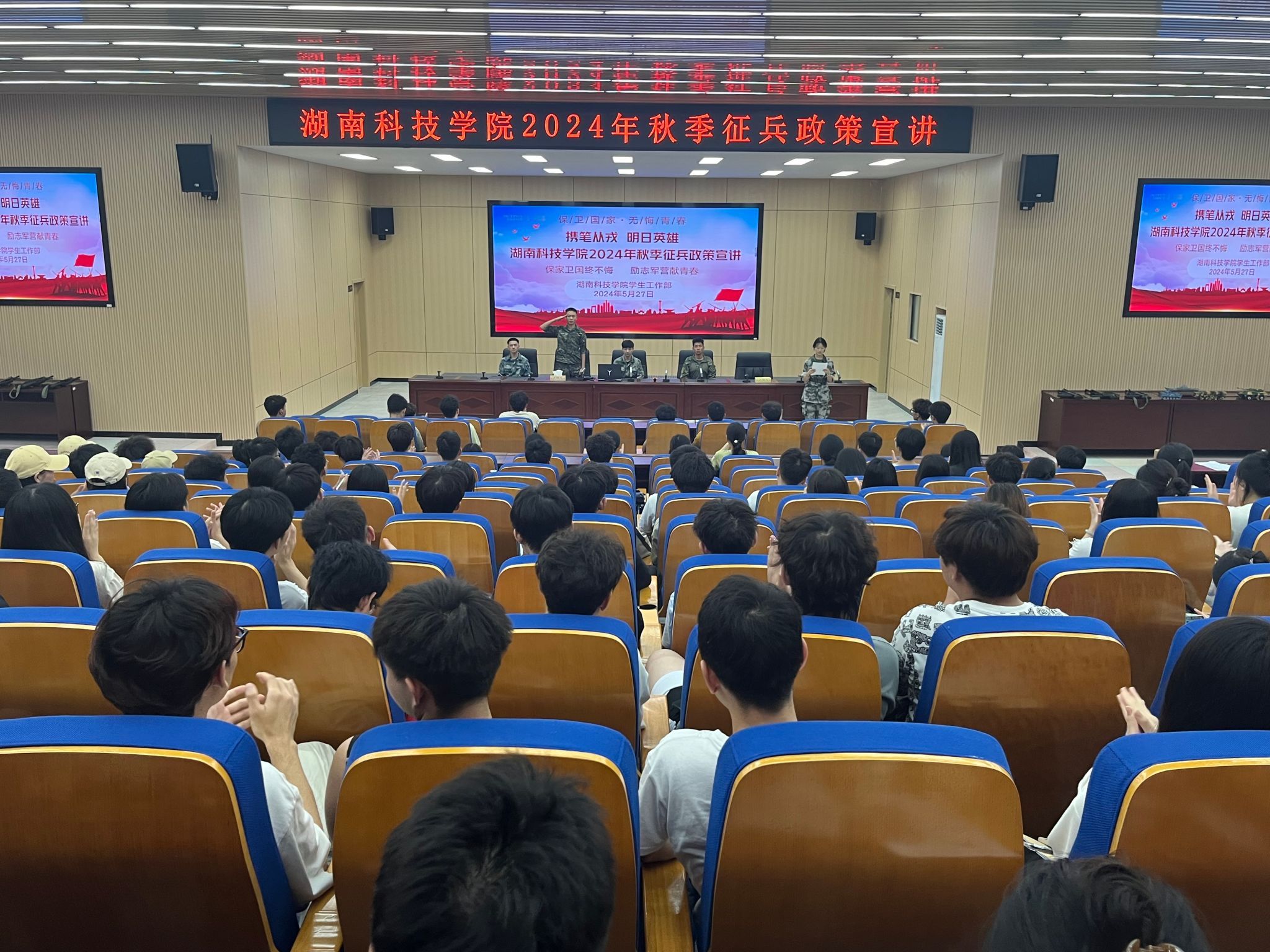 本网讯(学工部)5月27日,参军报国当少年,岁月无悔正青春。为贯彻落实习近平强军思想的重要举措,积极响应国家征兵政策,做好2024年秋季征兵工作,激发我校青年学子参军报国热情,充分发挥高校征兵主阵地作用,学校在明德楼100报告厅开展“‘携笔从戎,明日英雄’2024年秋季征兵政策宣讲”活动,活动吸引了近300人参加。
