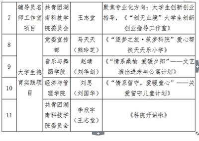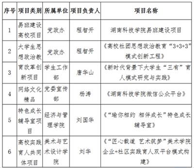 安博官网app2018年大学生思想道德素质提升工程建设项目,经我校组织专家严格评审,将推荐以下11个项目参评湖南省2018年大学生思想道德素质提升工程建设项目的评审。