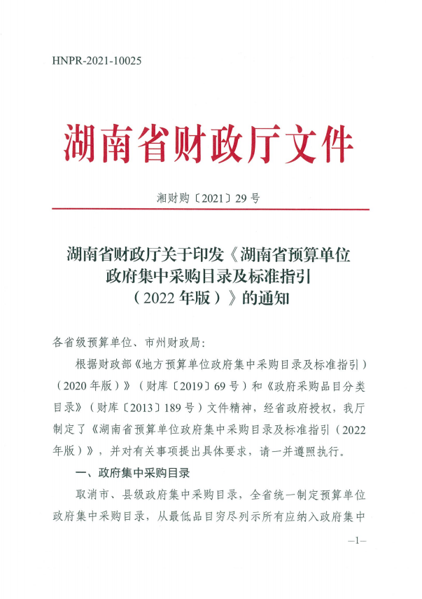 湖南省财政厅关于印发《湖南省预算单位政府集中采购目录及标准指引(2022年版)》的通知
