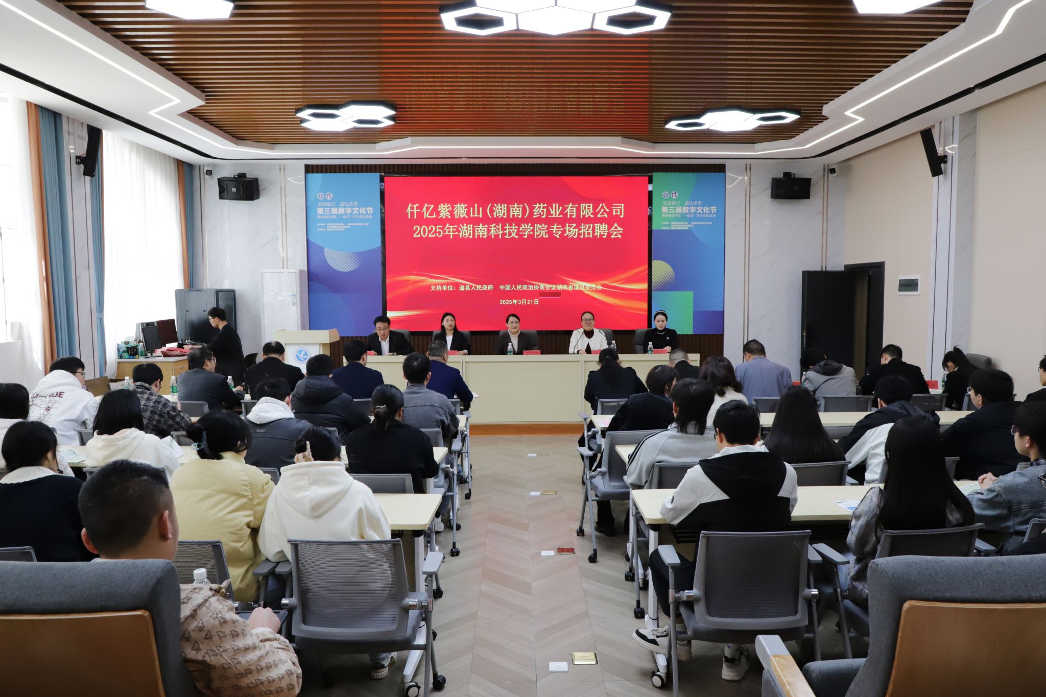 本网讯(通讯员 张亚南)3月21日,2025届毕业生道县高新区专场招聘会在我校举行。道县政协党组书记、主席刘忠华一行携省级高新技术企业仟亿紫薇山(湖南)药业有限公司代表团来校开展人才招聘。副校长郑银芳出席活动并致辞,安博中国与创新创业指导处处长胡清华主持活动。