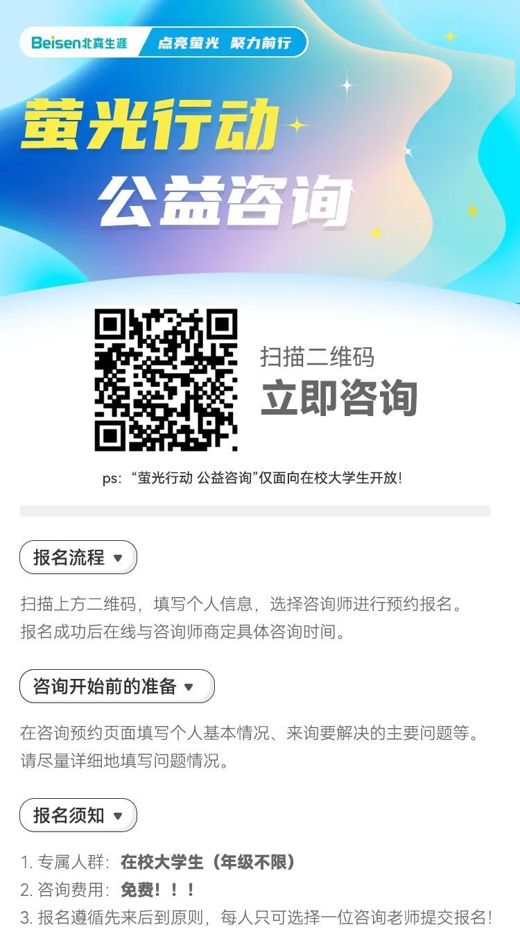为进一步提供有针对性、个性化的为校内外学生提供职业生涯规划、就业指导服务,学校特联合北森生涯学院开展“萤光行动”,包括线上课堂、线上咨询,期待同学们参与!