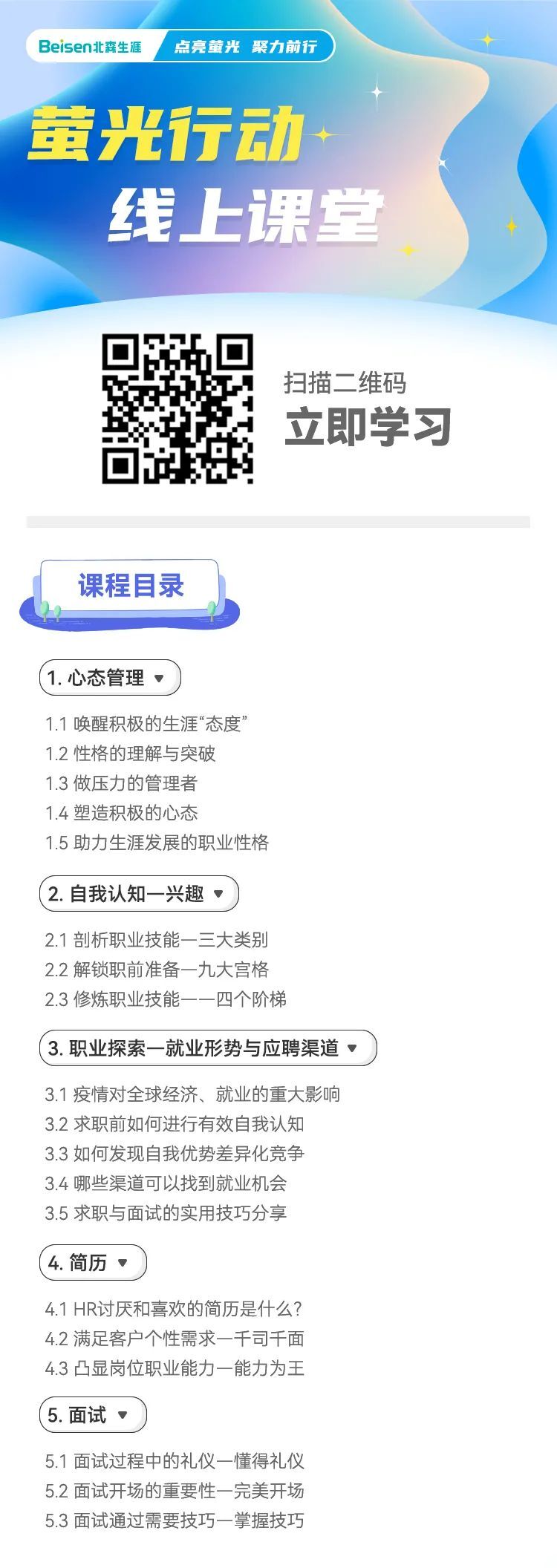 1、线上课堂:囊括“心态管理”、“自我认知”、“职业探索”、“简历指导”、“面试技巧”等多个模块,共计20节课程内容,为学生提供全面详尽的求职技能训练。扫二维码即可学习。
